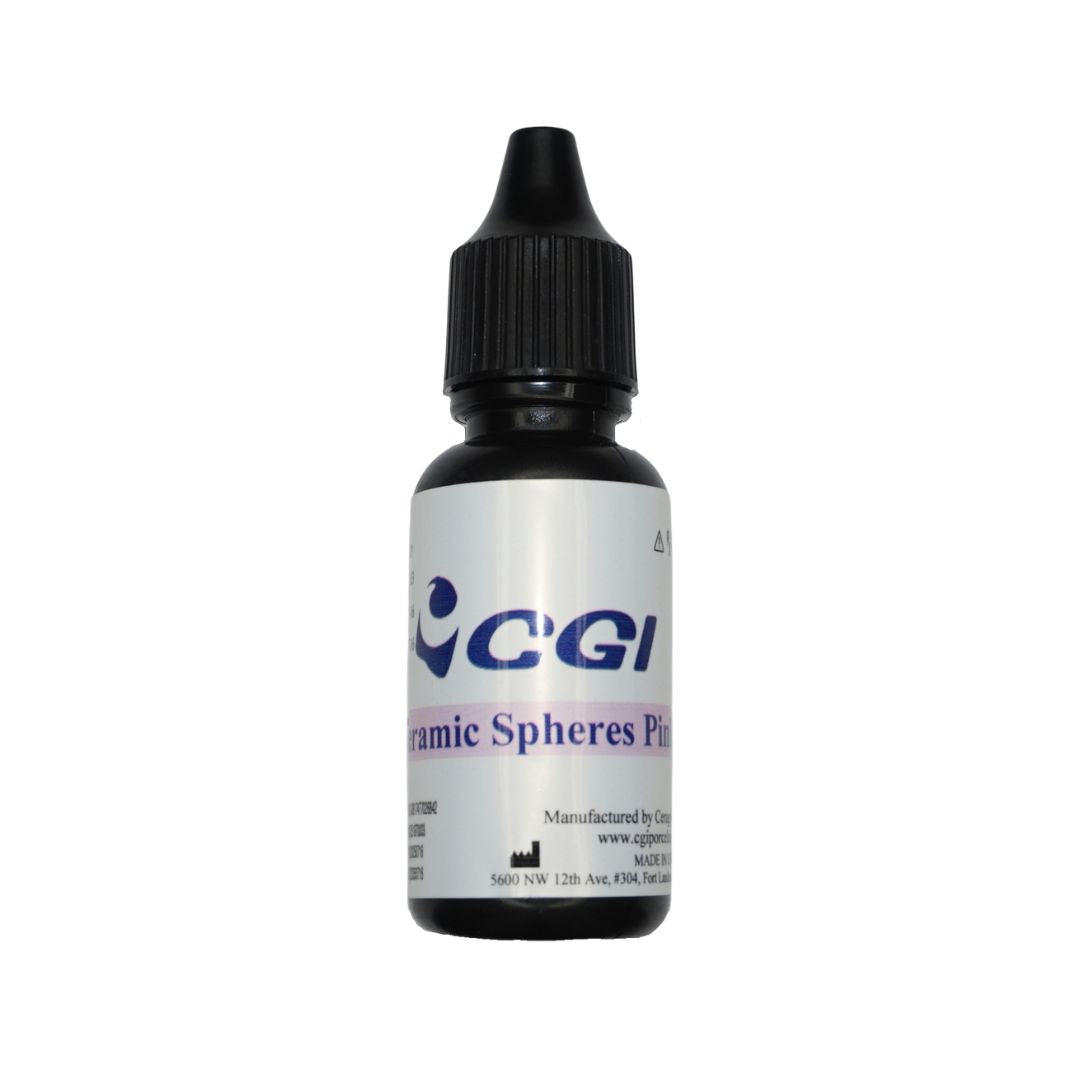 Ceramic Spheres from CGI are microscopic ceramic beads designed to be used with the Ti and Zir Bonding Systems to create a highly retentive surface on titanium or zirconia restorations. When applied into the bonding layer, they generate a rough, textured sandpaper-like topography that increases surface area and micromechanical undercuts, helping ceramics or composites lock onto the substructure more securely and reducing the risk of debonding over time. Available in pink and yellow colors.