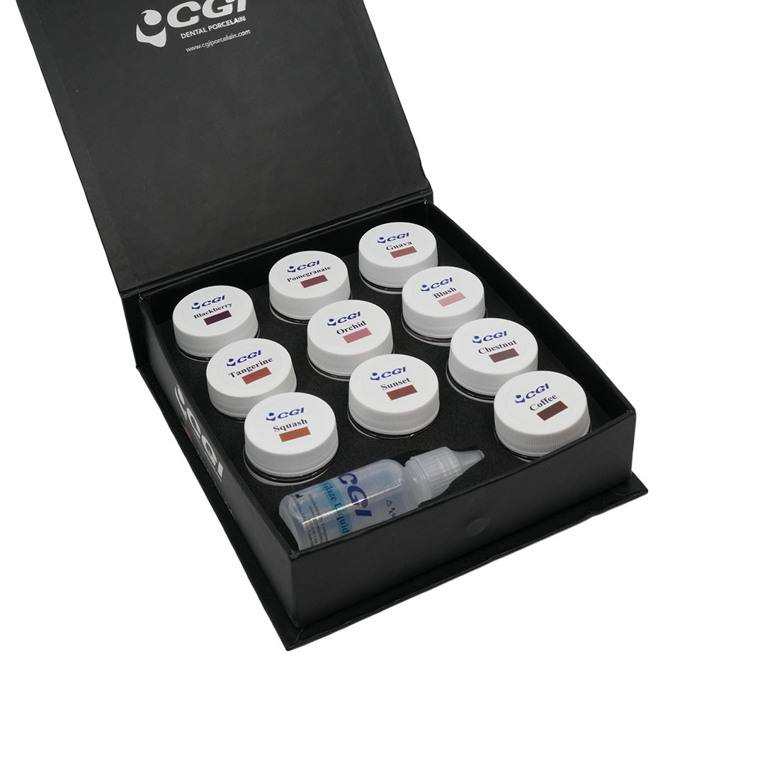 CGI Gum Shade Kit contains everything needed to fully recreate and characterize gum areas. The kit includes 10 paste gum shades and one paste liquid. Jars are 3g for the gum shades.